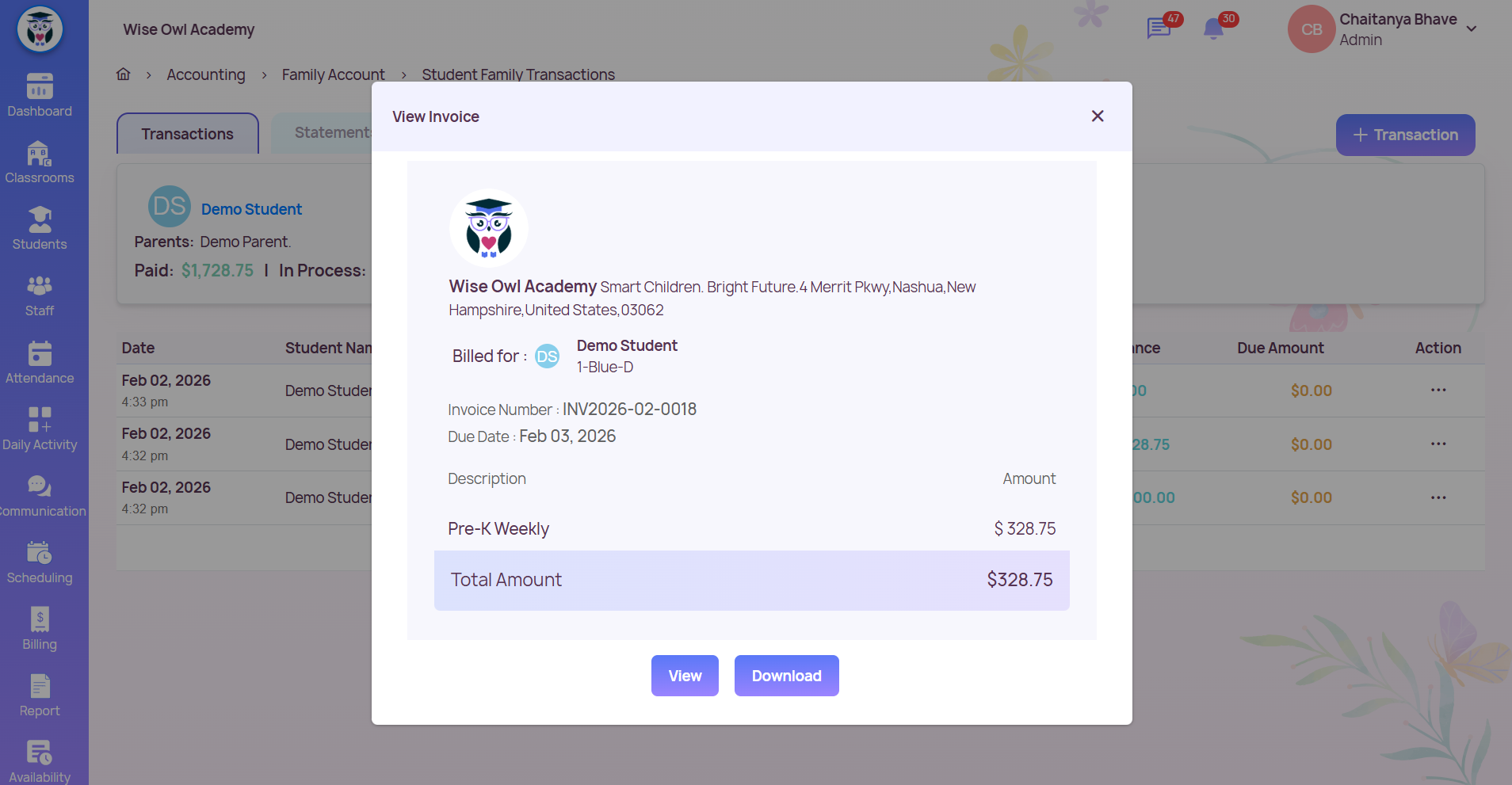 Admins can view all invoices, payments, and receipts for a student from the Family Account → Transactions Tab. ✅ View Invoice Details Go to Accounting from the left sidebar. Navigate to Family Account → Student Family Transactions. Select the student ...
