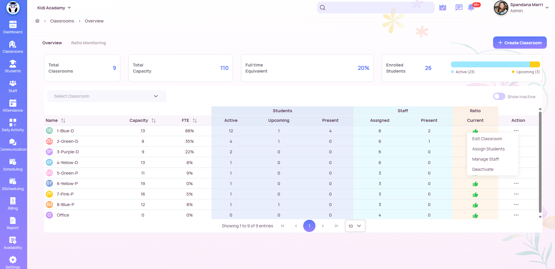 The 'Classroom Overview' functionality in WowCare provides a comprehensive view of all classrooms within your childcare center. It allows administrators and staff to monitor classroom capacity, student enrollment, staff assignments, and student-to-staff ratios, ensuring efficient management and organization.