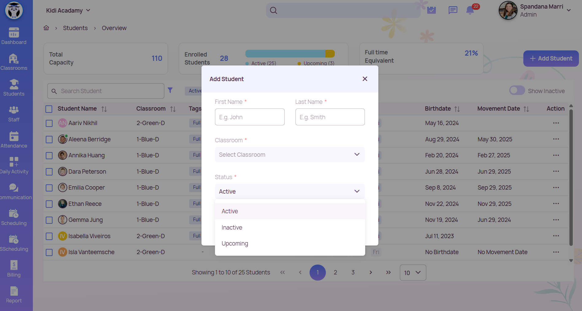 - A form will appear where you can enter the new student's details, such as their first name, last name, classroom assignment, and status. (active/upcoming etc.)