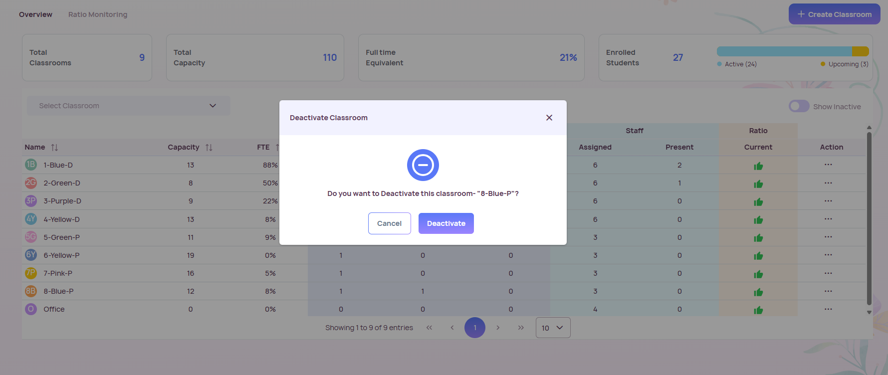 - Under the "Action" column click on the three dot icon for that classroom, click on "Deactivate ".