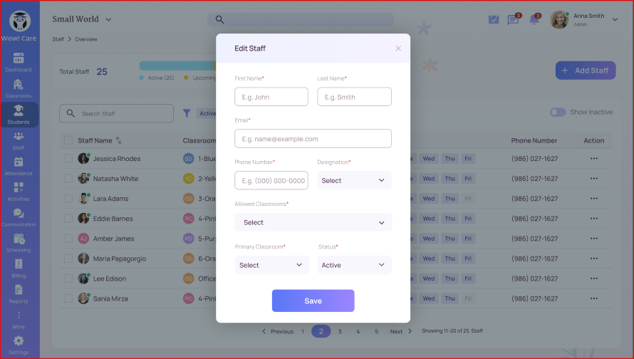 To edit the profile of a staff member: Navigate to the Staff section from the main menu. Click on the staff member’s name to open their profile. On the profile tab, click the pencil icon (edit button) in the top-right corner. In the Edit Staff ...