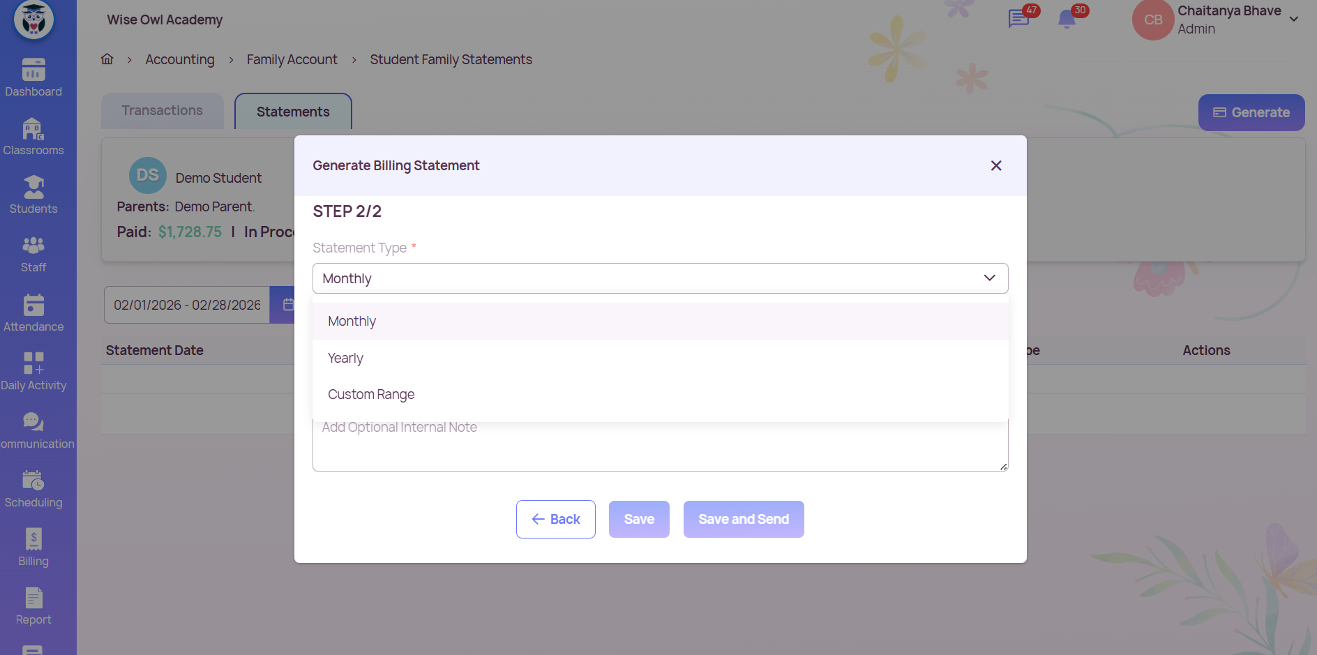 Parents can easily view and download billing statements for their child from the Billing / Family Account section.