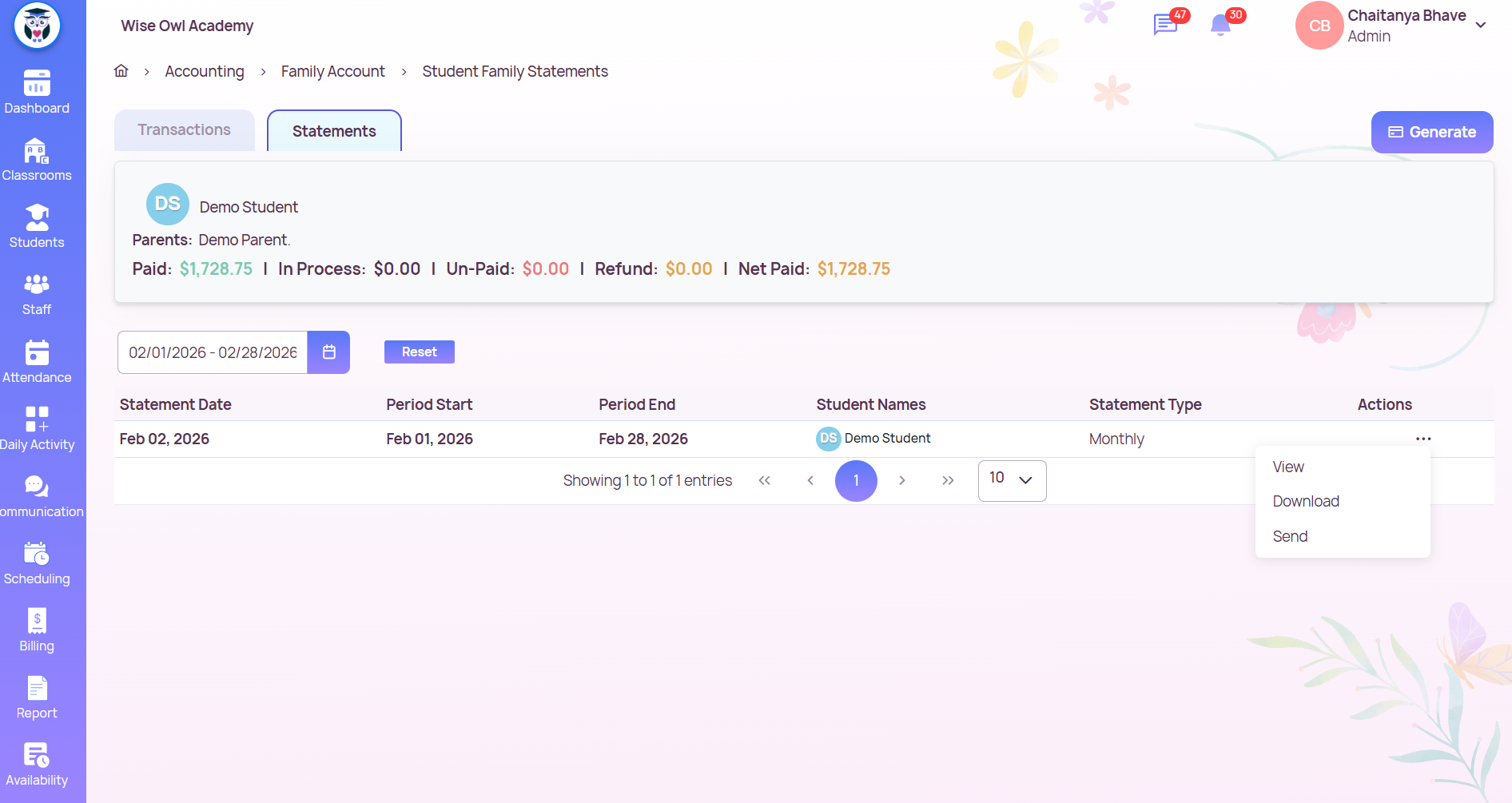 Admins can generate monthly, yearly, or custom billing statements for a student from the Family Account → Statements Tab.