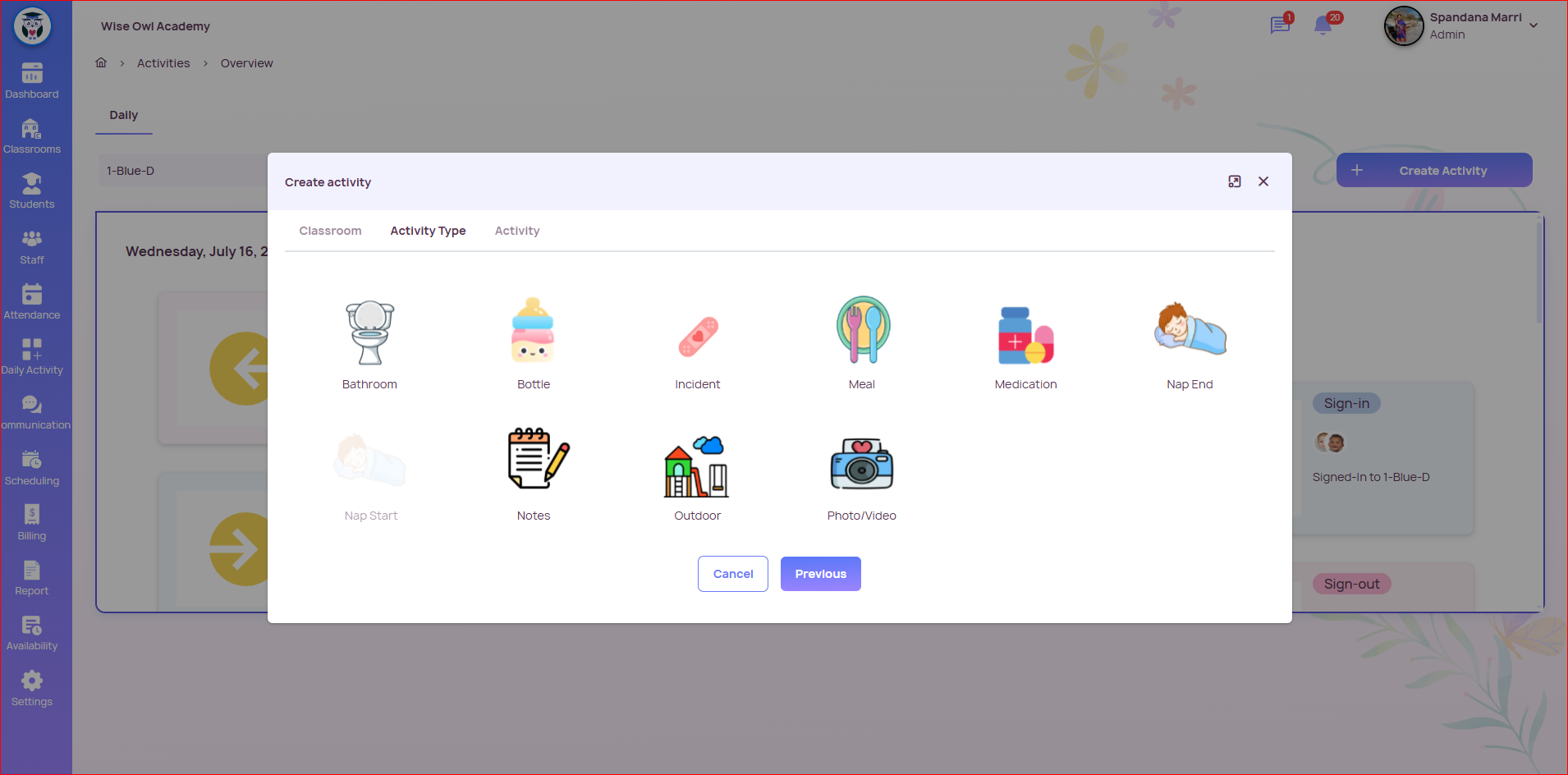 Choose the type of activity (e.g., Nap, Meal, bathroom, photo, outdoor, incident etc).