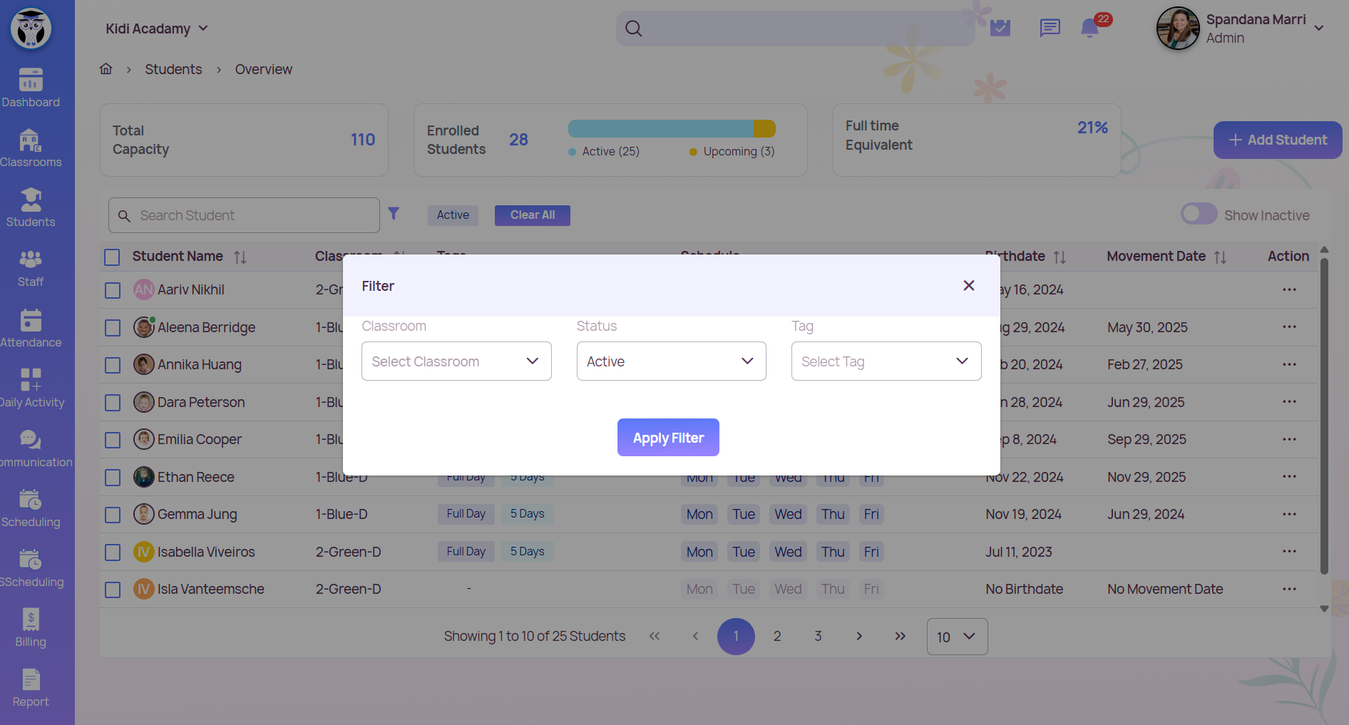 - Additionally, you can use other filtering options available, such as filtering by classroom , status or tags, usually located as dropdown menus above the student list in student overview or classroom profile.