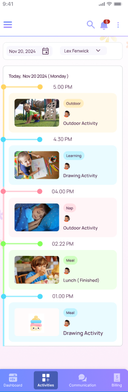 You will see a timeline view of your child’s daily activities such as meals, naps, bathroom, photos, outdoor play, incidents, and more.