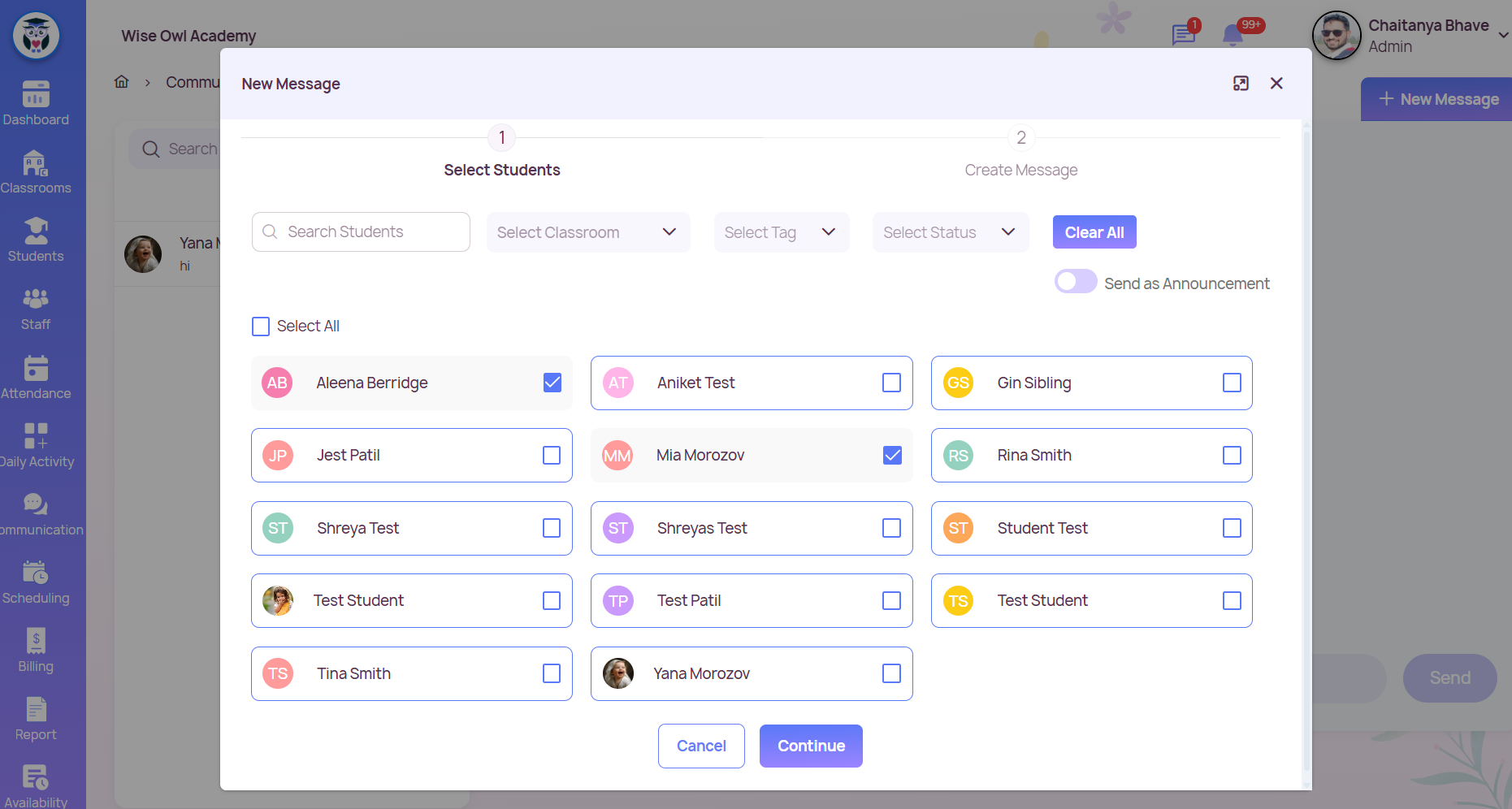 To View/Send Messages Open the Communication tab from the main menu. Select your child’s name from the top dropdown (if you have more than one enrolled). You’ll see all messages with staff members (admins, teachers etc.) associated with your child’s ...