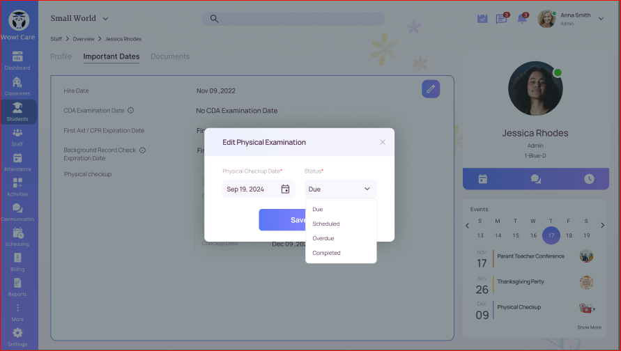 To view or edit a staff member's important dates: Navigate to the Staff tab from the left-hand menu. Click on the staff member’s name to open their profile. Select the Important Dates tab at the top of the profile. Here you can view key dates such ...