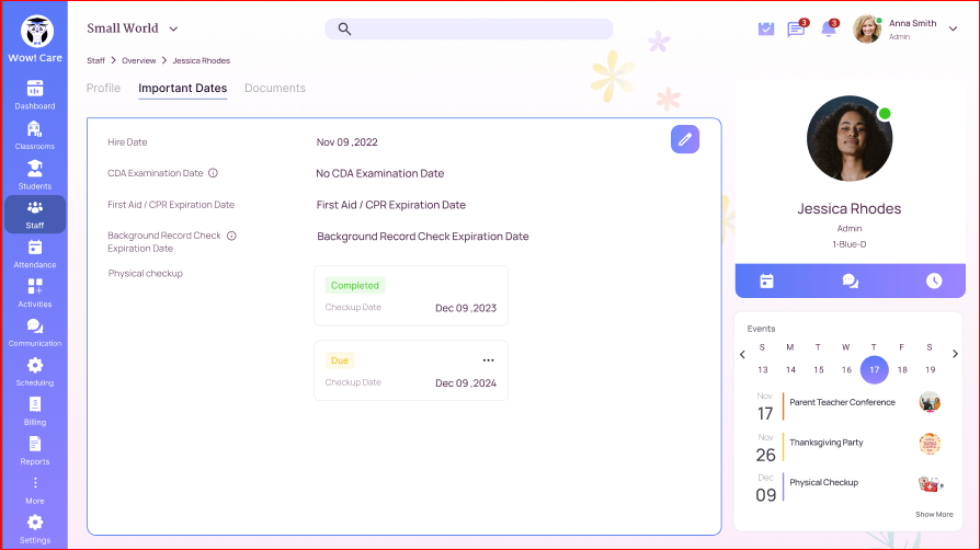 To edit or update the physical checkup details for a staff member: Navigate to the Staff tab in the left menu. Click on the staff member’s name (e.g., Jessica Rhodes). Go to the Important Dates tab. Locate the Physical Checkup section. Click the edit ...