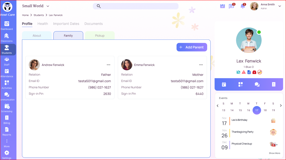 To ensure a child is picked up by an approved person, follow these steps to add them under the Pickup tab: From the left-side menu, go to the “Students” section. Click on the student’s name. Make sure you're on the “Profile” tab, then select the ...