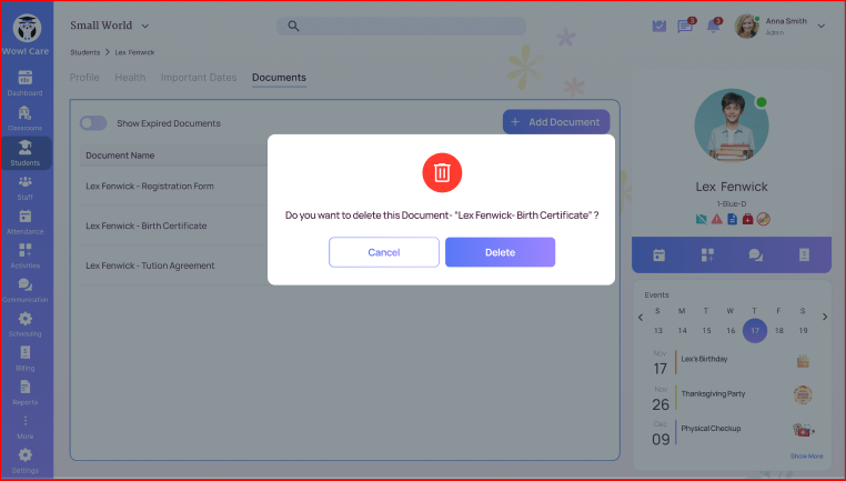 You can store important documents like registration forms, birth certificates, or tuition agreements directly in WowCare. Here’s how to upload a new document: Go to the “Students” section and select a student (e.g., Lex Fenwick). Click on the ...
