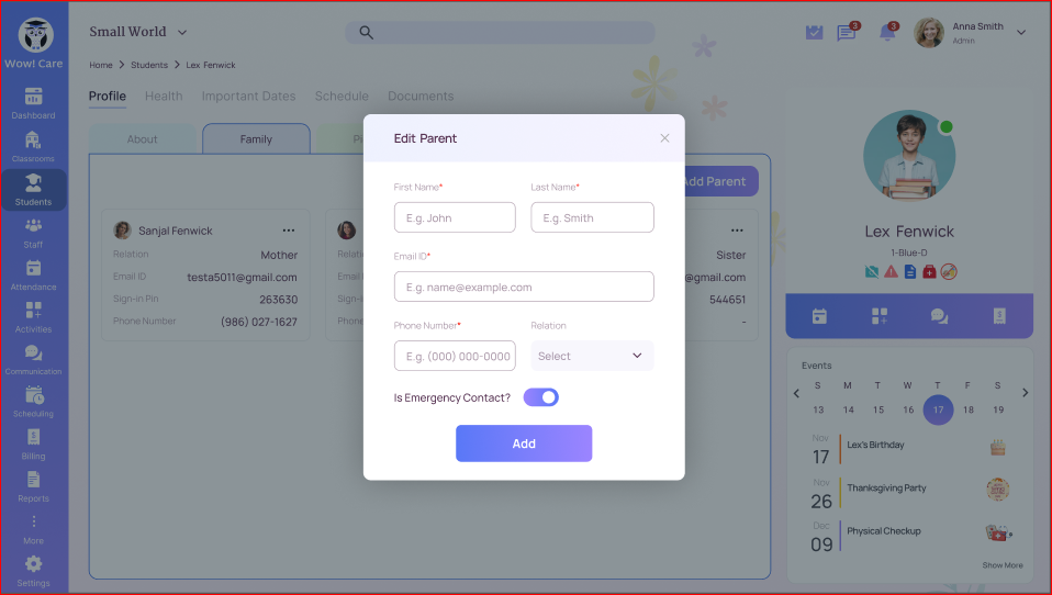 To add a parent or guardian under a student’s Family tab: Go to the "Students" section from the left menu. Click on the student whose profile you want to edit (e.g., Lex Fenwick). Ensure you're on the "Profile" tab. Click on the "Family" sub-tab. ...