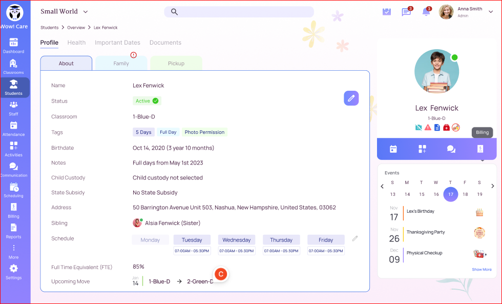 - Make the necessary changes to fields such as Name, Status, Classroom, Tags, Birthdate, Notes, Address, or Schedule etc.