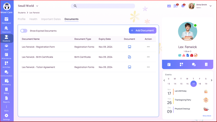 You can store important documents like registration forms, birth certificates, or tuition agreements directly in WowCare. Here’s how to upload a new document: Go to the “Students” section and select a student (e.g., Lex Fenwick). Click on the ...