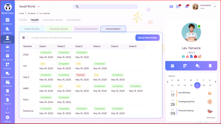 Click “Send Reminder” to notify parents or guardians about upcoming or overdue immunizations.
