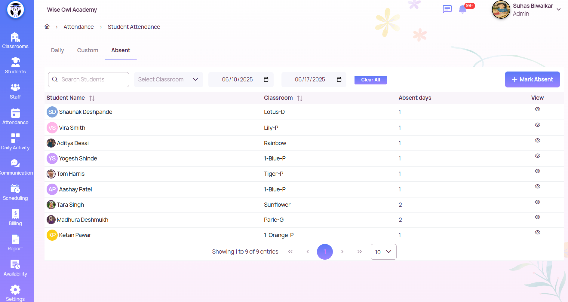 To manually mark a student as absent, click the + Mark Absent button in the top-right corner.