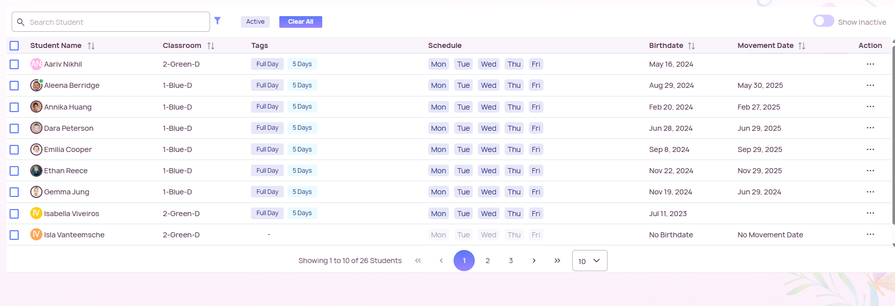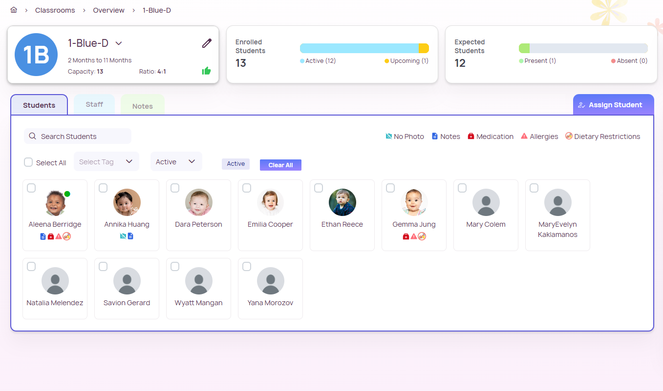 The Classroom Profile provides a detailed view of a specific classroom within your childcare center. Here, you can see the enrolled students, assigned staff, notes, and other relevant information for the selected classroom, allowing for focused ...