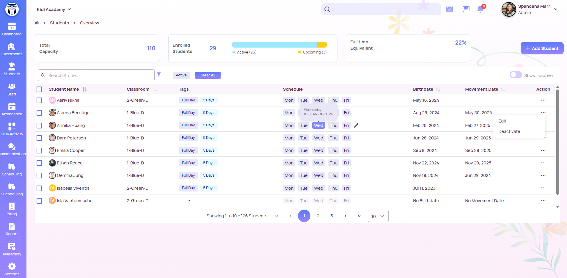 The Student Overview functionality in WowCare provides a centralized view of all students enrolled in your childcare center. It allows administrators and staff to quickly access key information about each student, such as their assigned classroom, status, attendance status, tags, schedule, birthday, and recent movement, facilitating efficient student management.