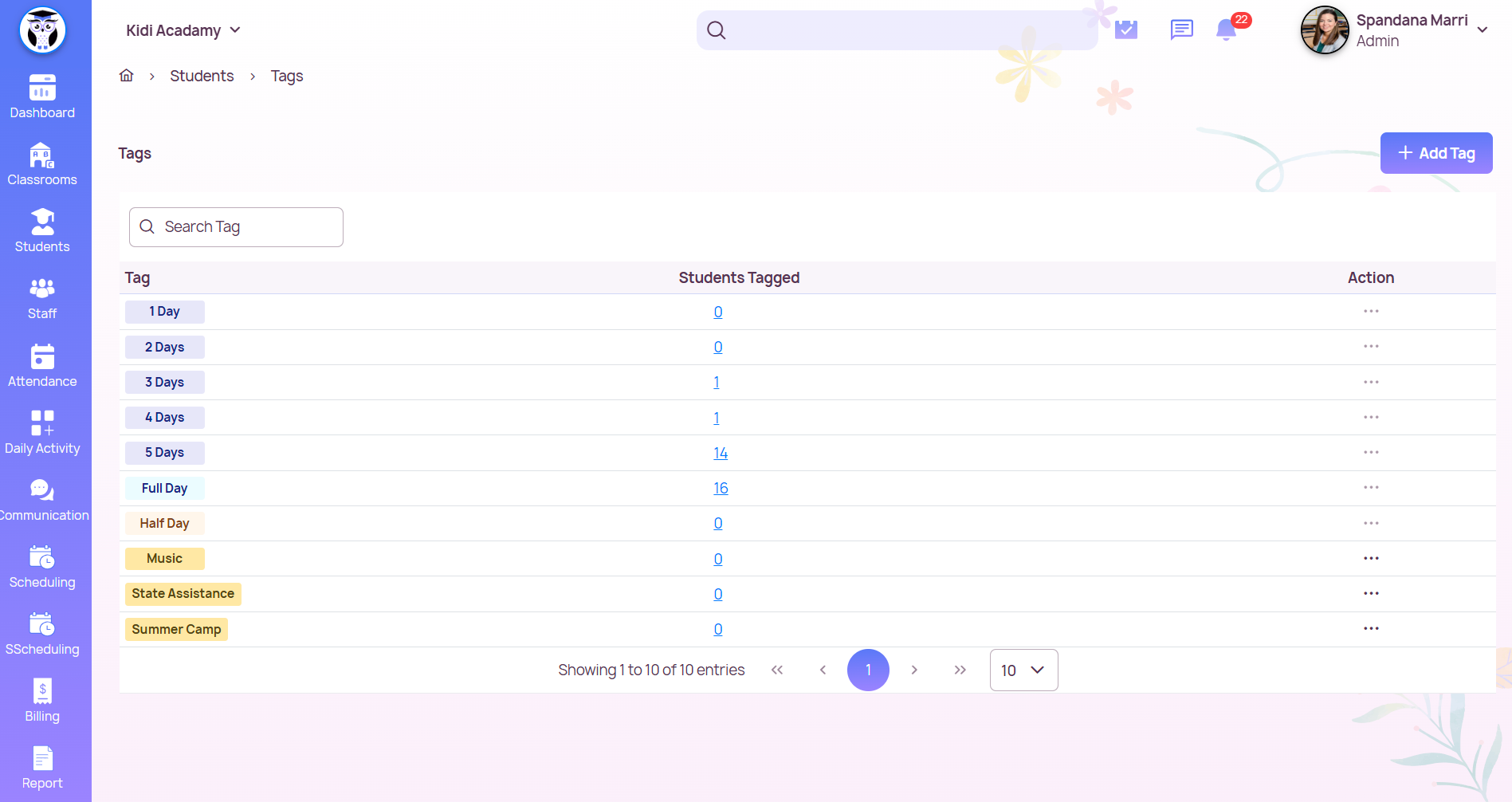 - Tag: The name of the tag (e.g., "1 Day," "Full Day," "Music").